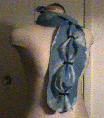 I still can't get it to make a flat panel, but I did make an interesting effect with the tube. I made it exactly as long as I wanted the scarf and then with a secondary yarn (I choose to match my color, but since you can't hardly see it, any color would be fine) and evenly spaced some running stitches. By pulling on those running stitches tightly, the tube squished up to make a very cute chain of bubbles or... well they would have looked like sausage links if it was in pink! If you were so inclined, you could even stuff those bubbles for a more substantial third dimension and a quilted feeling scarf. Call it hotdogs XD
